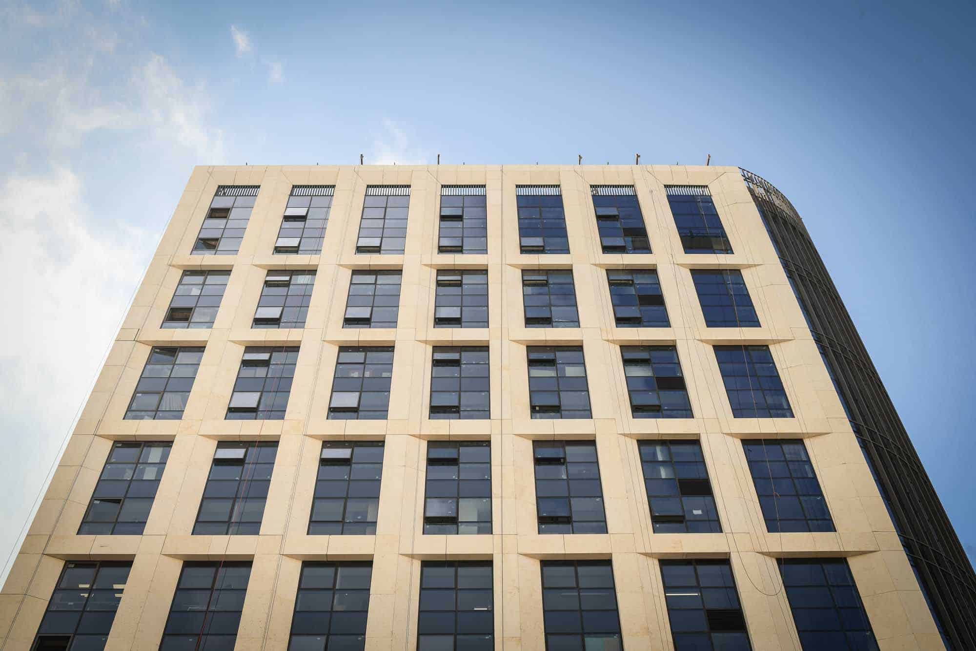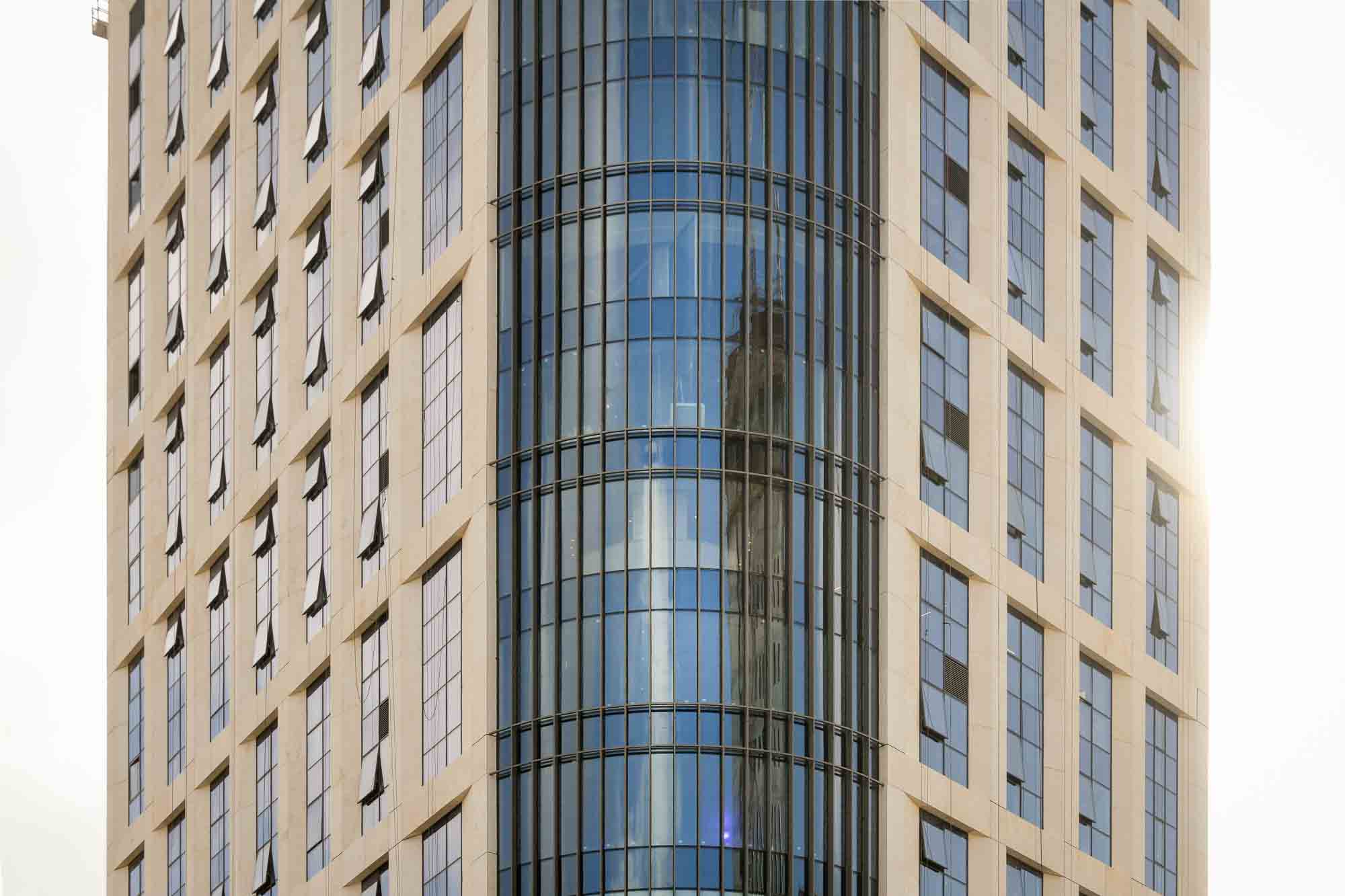 The south-western facade of the building is covered with a rounded curtain wall composed of insulated glazing in configurations 6-24-6 | 6-22-8, and curved glazing units in the configuration 6-20-10. All the glazing units in the project feature SN 63 HT solar control glass by GUARDAIN, with 62% light transmission and 31% energy transmission. The remaining facades of the building are covered with smaller curtain walls made of identical insulated glazing units as the main curtain wall. In the spandrel areas, a full ceramic print was applied on face #3 within the glazing unit’s spacer.