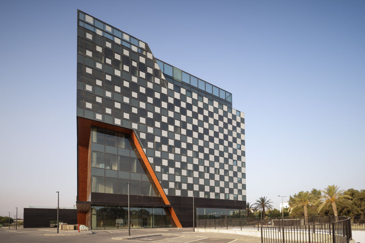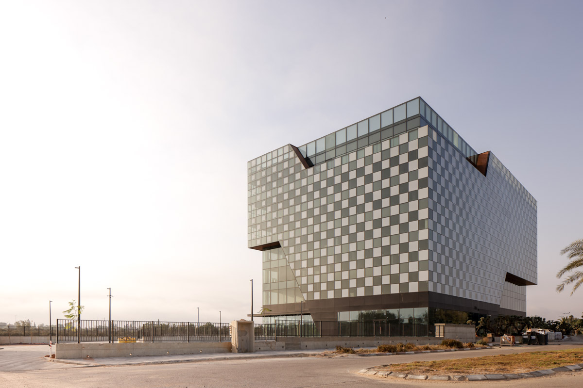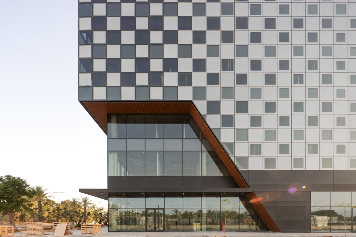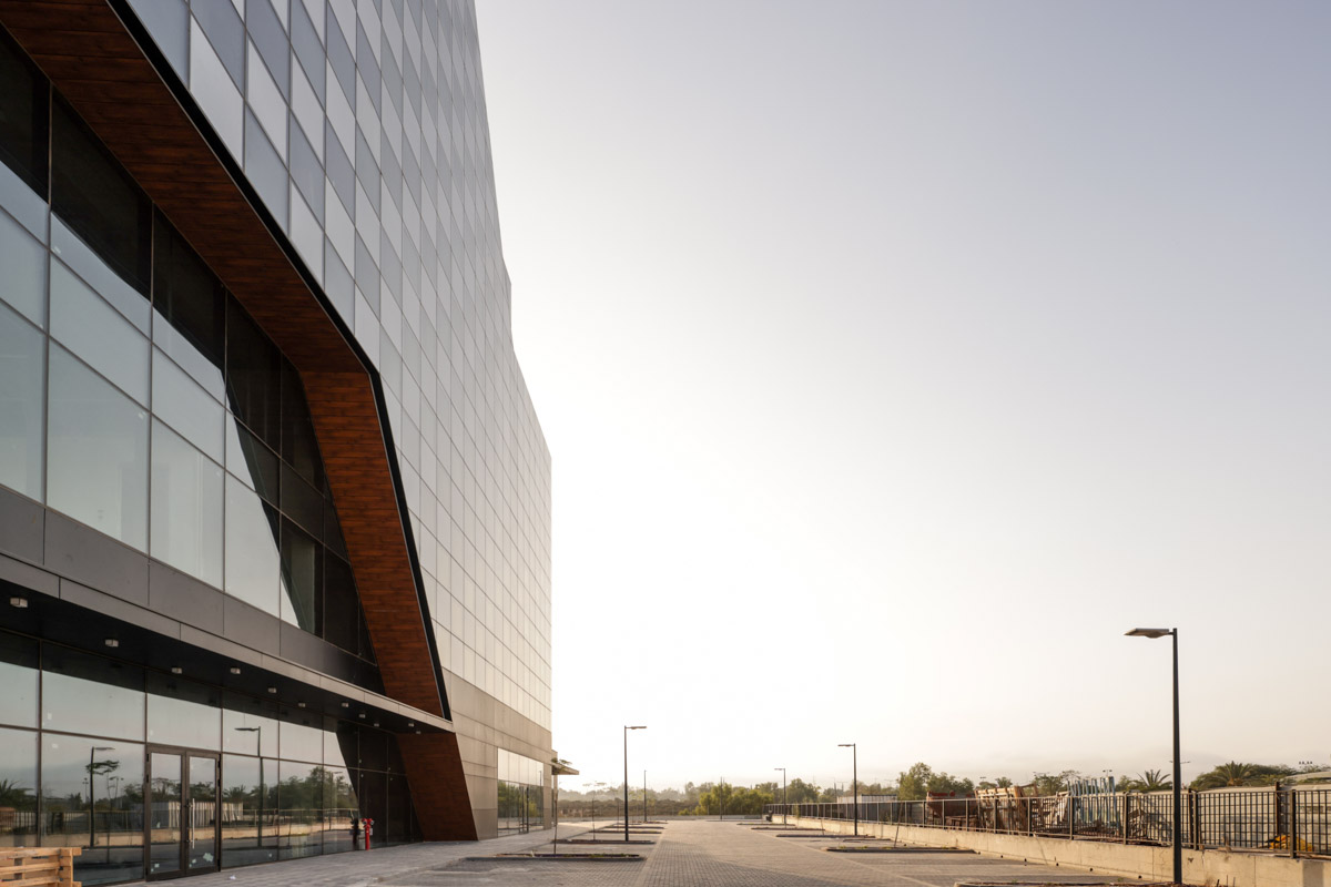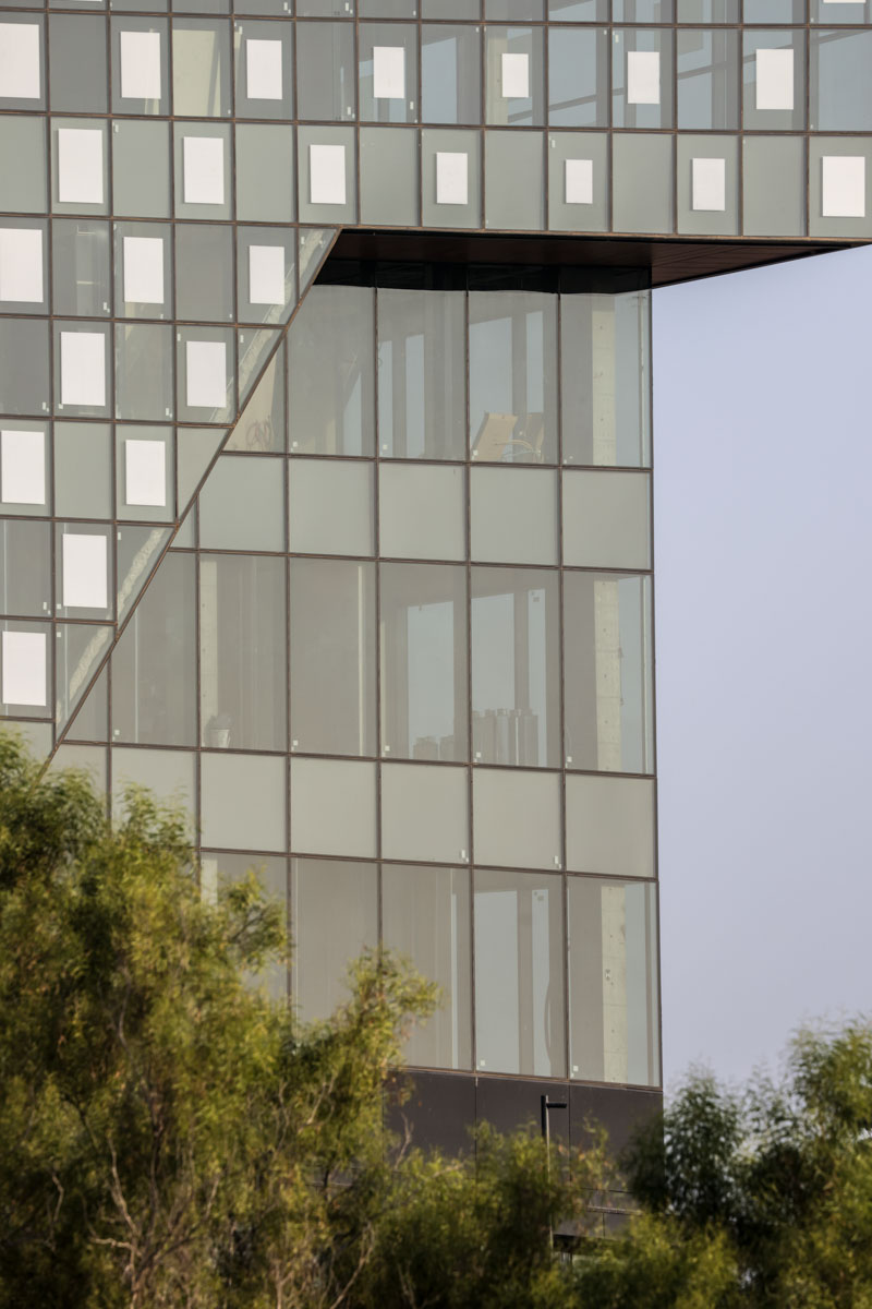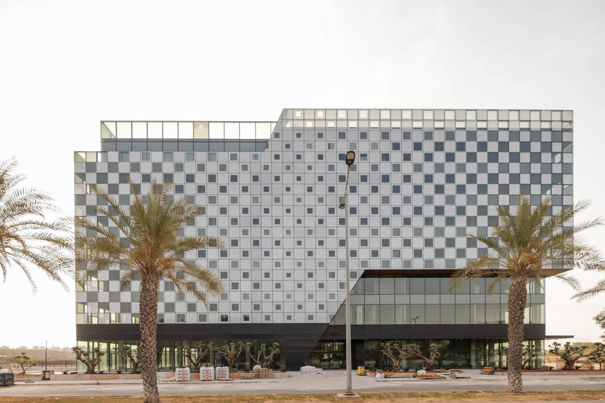 A unique project featuring a façade entirely clad with curtain walls, glazed with insulating glass units in various compositions (6-14-10 | 6-18-6 | 6+6/16/6). In the office floors, solar control glazing of the Solarban 60 on OptiGrey type from Vitro (USA) was used, triple sliver layers that provide 50% light transmittance, 28% energy transmittance, and exceptionally low reflectivity of only 8%. To create the unique reflective appearance, an additional layer of Ultra Clear glass was added to the insulating glass units in order to apply a negative dot print with 80% coverage, featuring transparent dots with a diameter of 2 mm. This design achieves the desired architectural aesthetic from the outside while still allowing occupants to see out and enjoy natural light inside the building. The commercial floor was glazed with insulating glass units in the compositions 8-16-6 and 8-12-10, respectively, according to the size of the units. These glass units feature solar control glazing of the SN 70/37 HT type by Guardian, with 69% light transmittance and 36% energy transmittance.