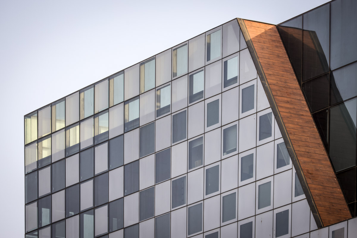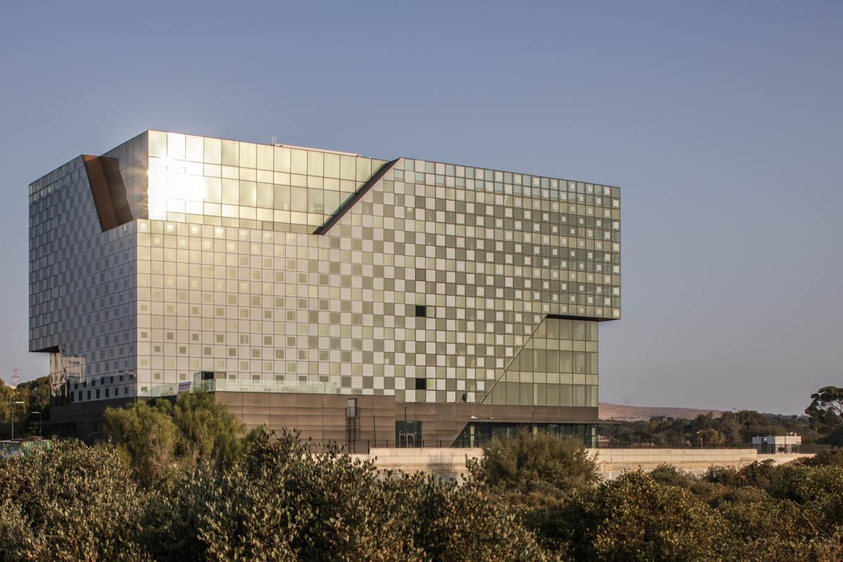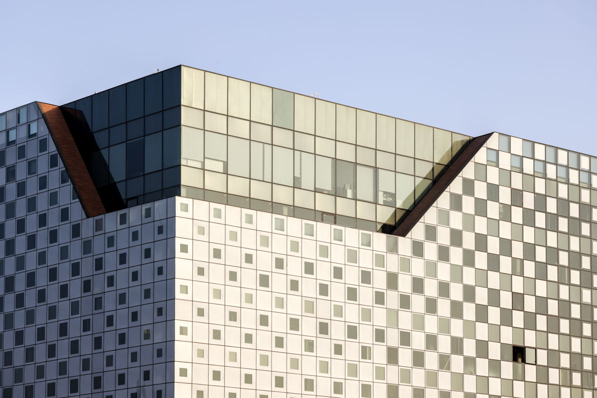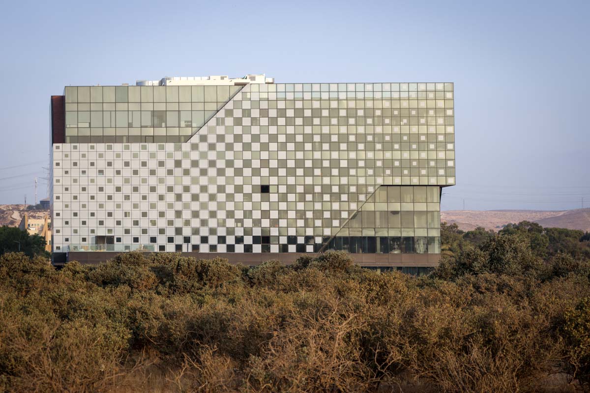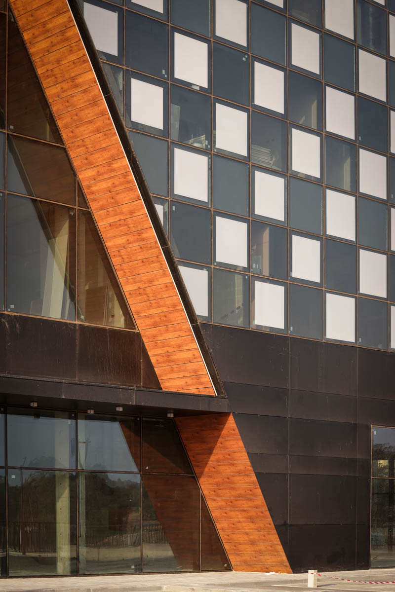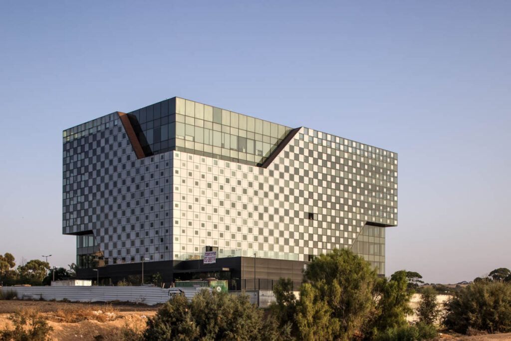 A unique project featuring a façade entirely clad with curtain walls, glazed with insulating glass units in various compositions (6-14-10 | 6-18-6 | 6+6/16/6). In the office floors, solar control glazing of the Solarban 60 on OptiGrey type from Vitro (USA) was used, triple sliver layers that provide 50% light transmittance, 28% energy transmittance, and exceptionally low reflectivity of only 8%. To create the unique reflective appearance, an additional layer of Ultra Clear glass was added to the insulating glass units in order to apply a negative dot print with 80% coverage, featuring transparent dots with a diameter of 2 mm. This design achieves the desired architectural aesthetic from the outside while still allowing occupants to see out and enjoy natural light inside the building. The commercial floor was glazed with insulating glass units in the compositions 8-16-6 and 8-12-10, respectively, according to the size of the units. These glass units feature solar control glazing of the SN 70/37 HT type by Guardian, with 69% light transmittance and 36% energy transmittance.
