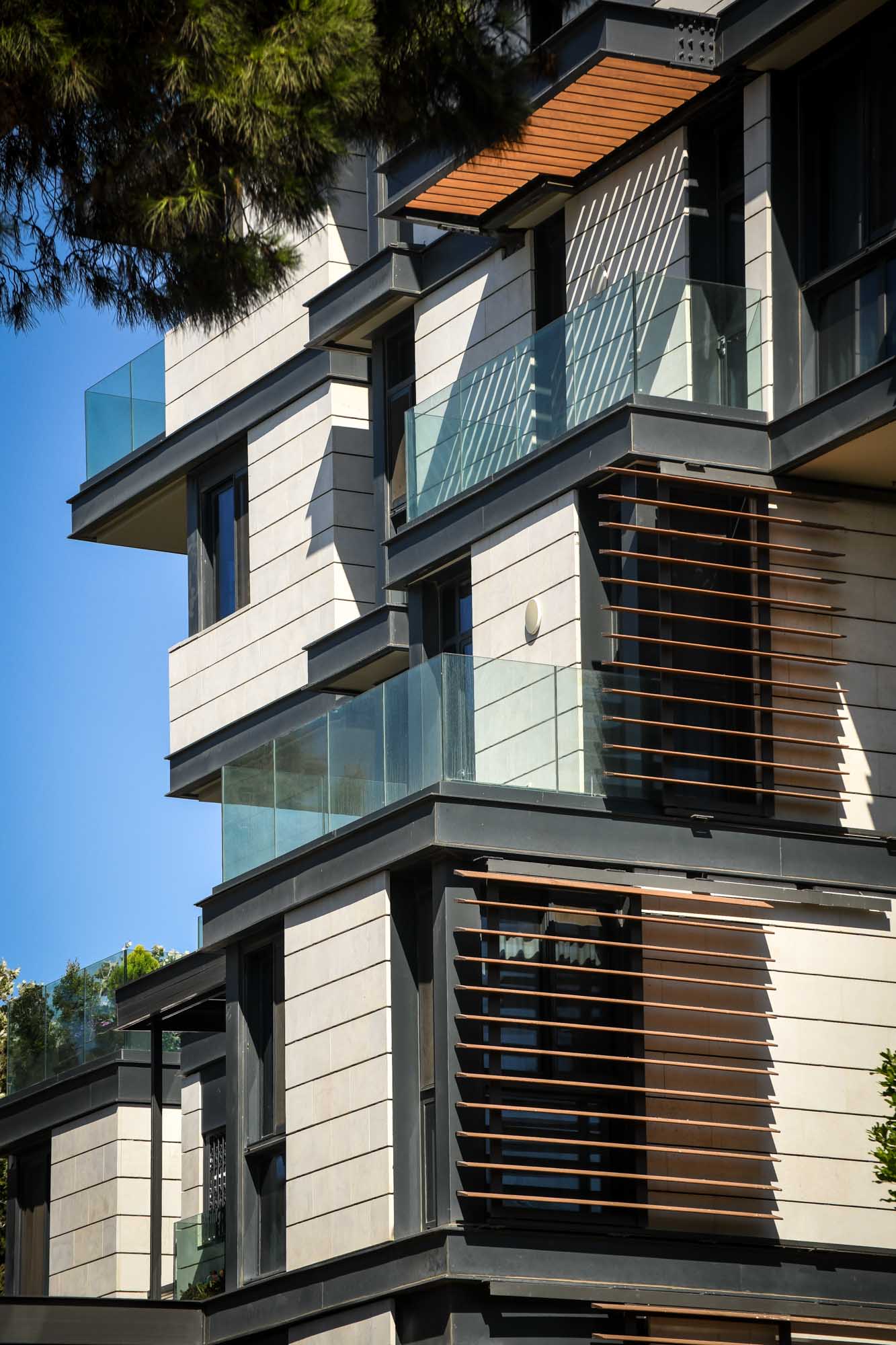 The project features a building façade with a structural curtain wall system manufactured by Extal, Model Matrix, incorporating an exterior glazing with solar control properties, Solarban Z-50 by Vitro, based on OptiGrey low-emissivity glass with 51% light transmittance, 32% energy transmittance, and exceptionally low exterior reflectivity (8%). The 8mm thick LOW E glass is integrated into an insulating glass unit with a layer configuration of 88.4/16/8 or 68.4/16/10, featuring ceramic dot patterns. Additionally, the LOW E glass is used in various configurations depending on the size of the openings in each apartment.