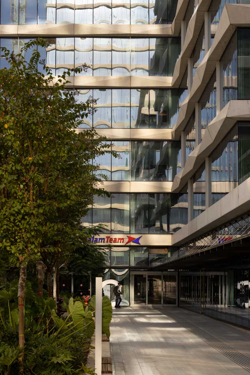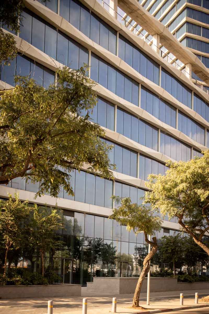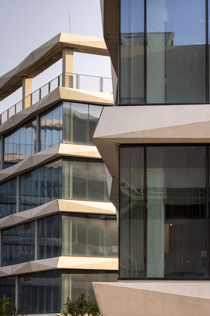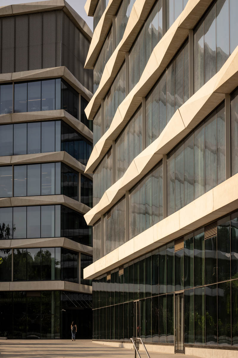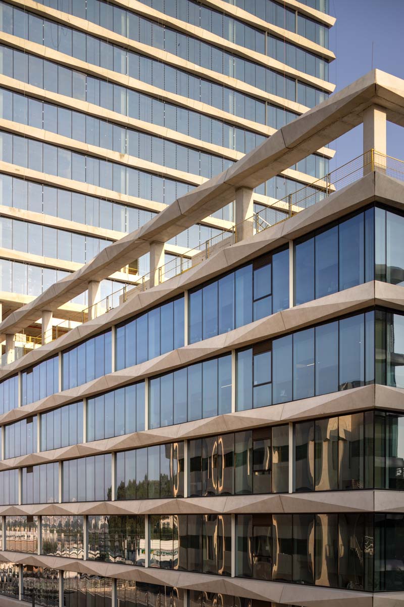 The building façades are clad with structural curtain walls made up of insulating glass units in the compositions 6-20-8, 6-16-6, and 6-18-10, featuring solar control glazing of the STOPRAY VISION 52T type by AGC, with 50% light transmittance and 28% energy transmittance. Additionally, a ceramic dot pattern with 50% coverage has been printed on parts of the building to provide additional shading to areas exposed to sunlight for most of the day. In the open spaces of the complex, glass canopies have been installed with a laminated double-glazing configuration, 8mm + 8mm , with an exceptionally durable SGP interlayer. A ceramic dot print was also applied to provide the necessary shading during peak hours of the day.
