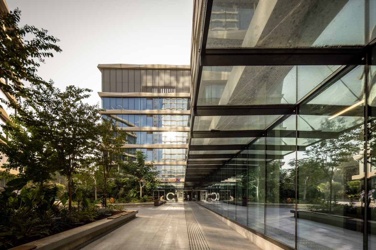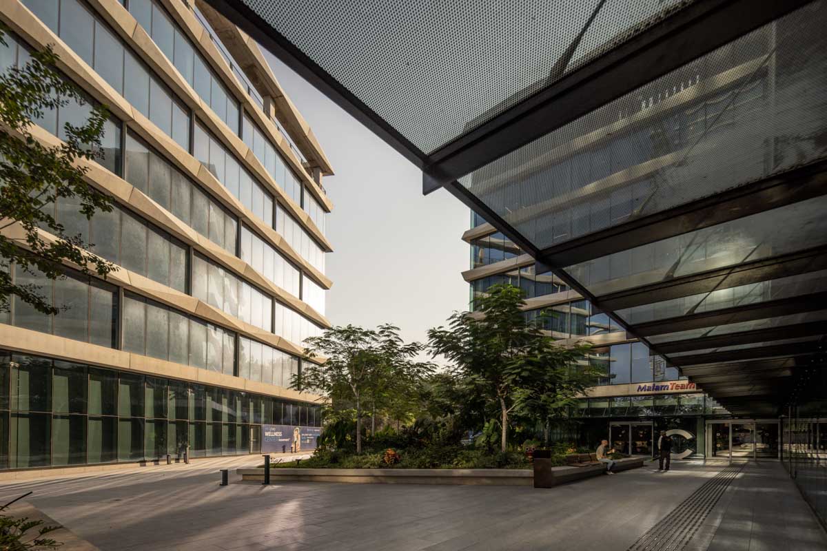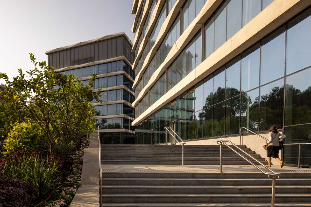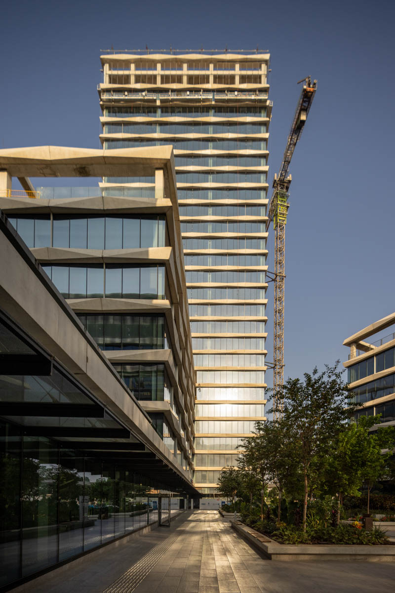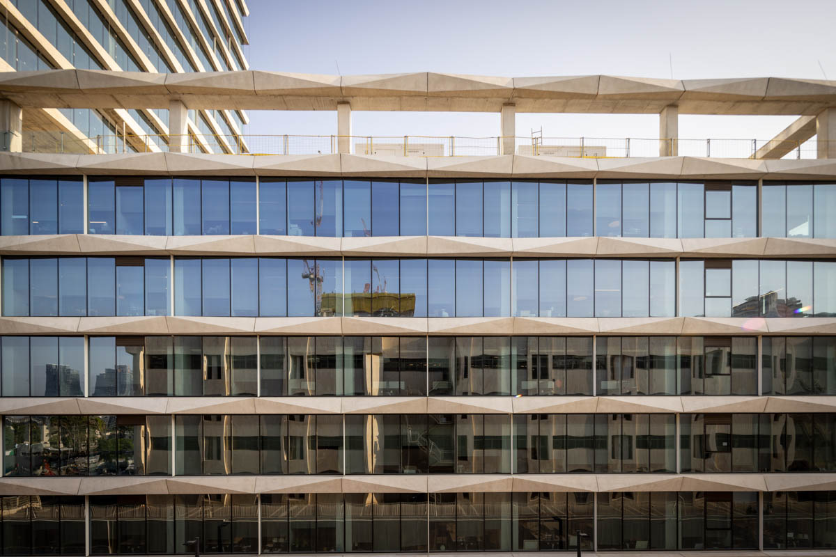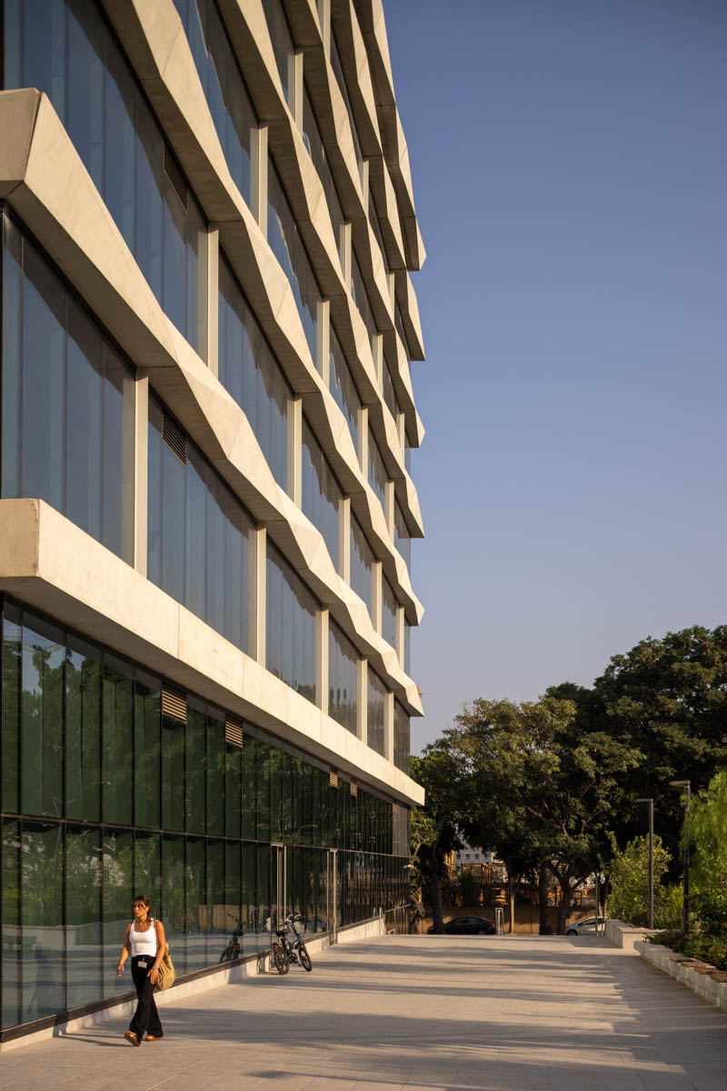 The building façades are clad with structural curtain walls made up of insulating glass units in the compositions 6-20-8, 6-16-6, and 6-18-10, featuring solar control glazing of the STOPRAY VISION 52T type by AGC, with 50% light transmittance and 28% energy transmittance. Additionally, a ceramic dot pattern with 50% coverage has been printed on parts of the building to provide additional shading to areas exposed to sunlight for most of the day. In the open spaces of the complex, glass canopies have been installed with a laminated double-glazing configuration, 8mm + 8mm , with an exceptionally durable SGP interlayer. A ceramic dot print was also applied to provide the necessary shading during peak hours of the day.